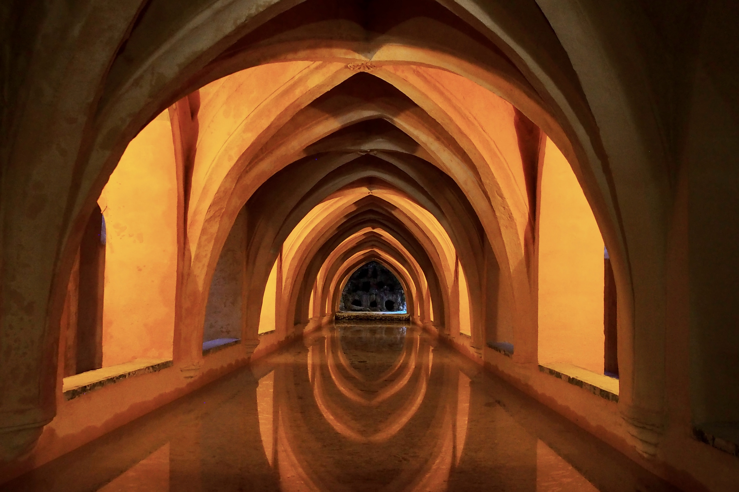 A repeating series of arches stretches into the distance, their reflections forming a perfect mirrored tunnel of light, symmetry and perspective.