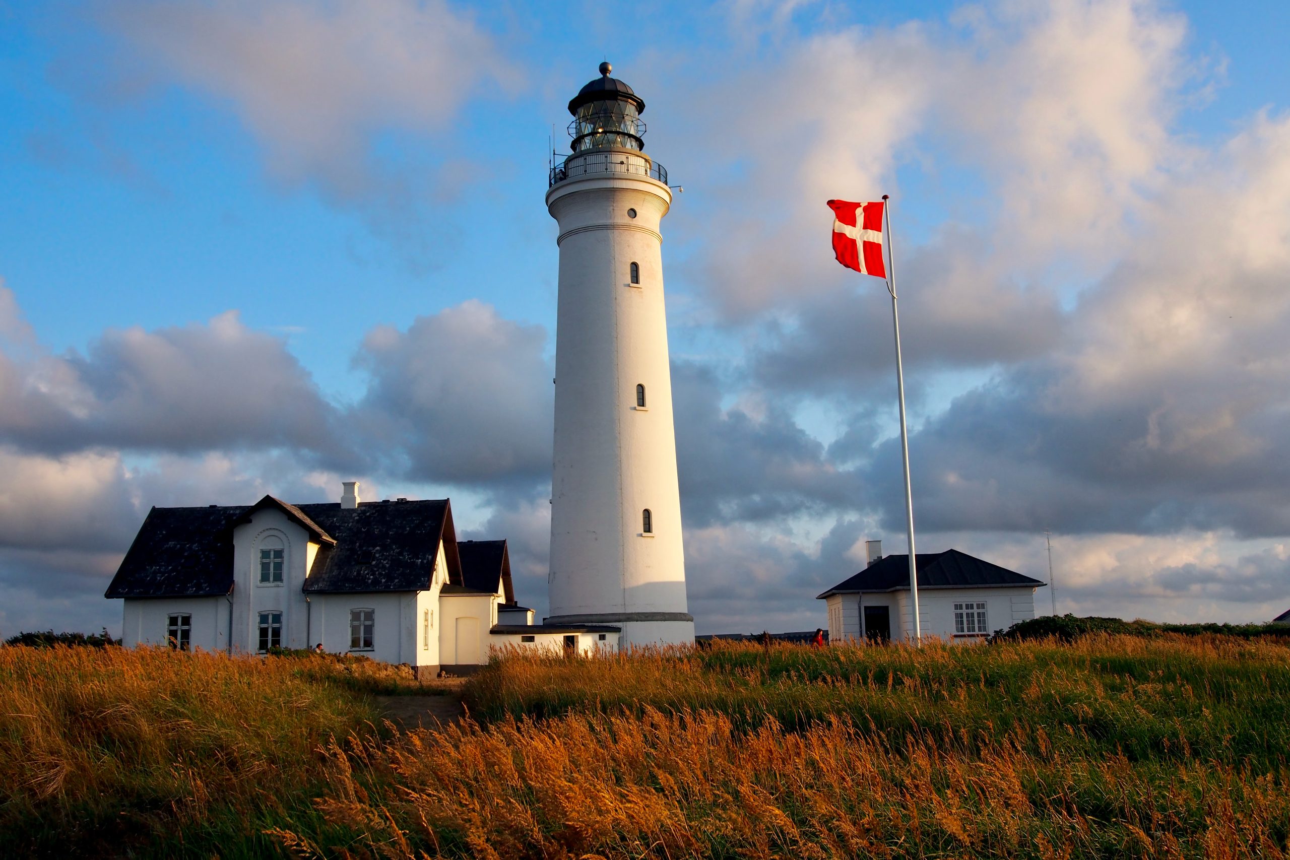 A coastal lighthouse stands against a moody sky, the Danish flag catching the wind above golden grasslands at the water’s edge.