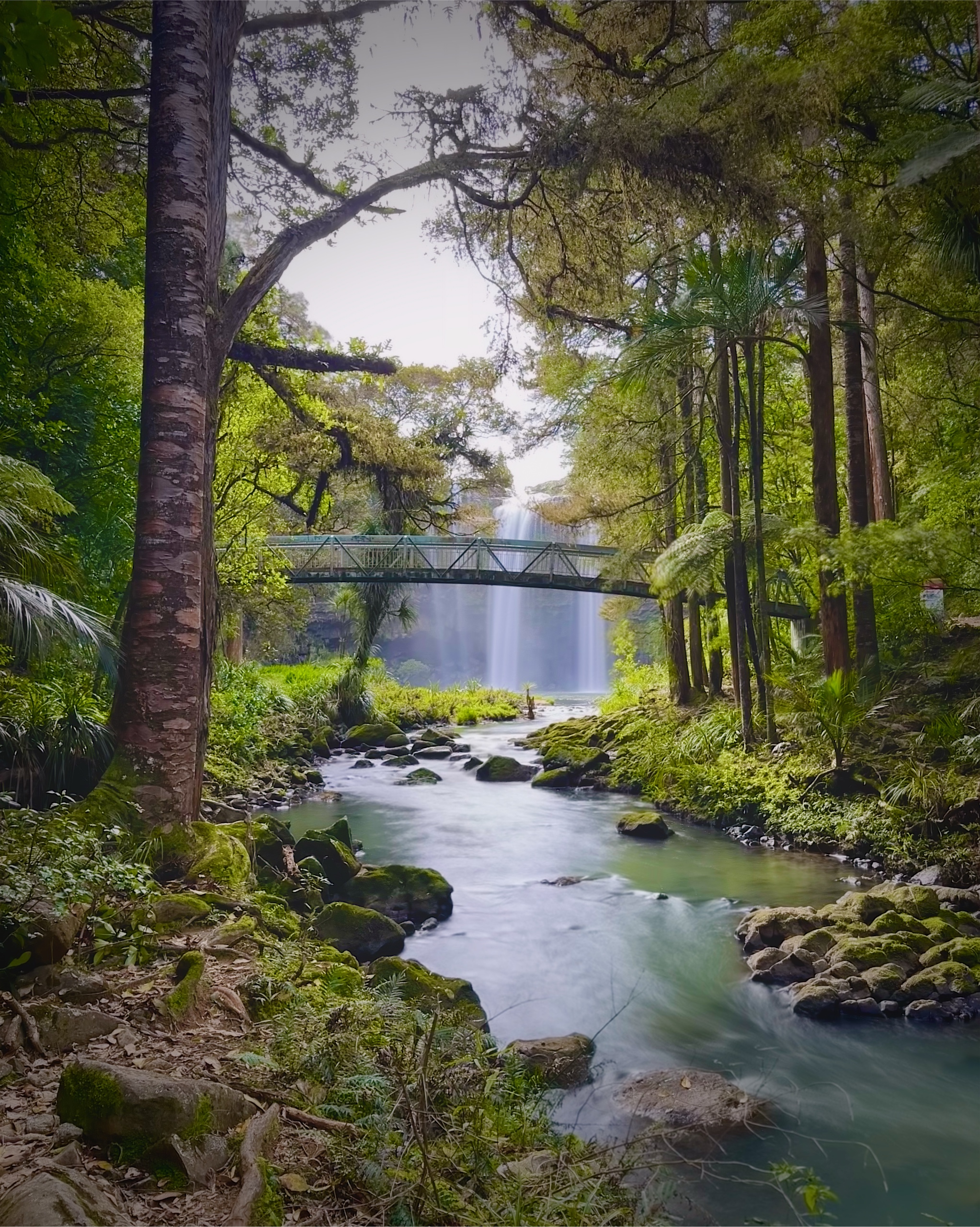 A quiet forest stream flows beneath a small bridge, surrounded by lush greenery and soft light filtering through the trees, evoking a peaceful natural escape.