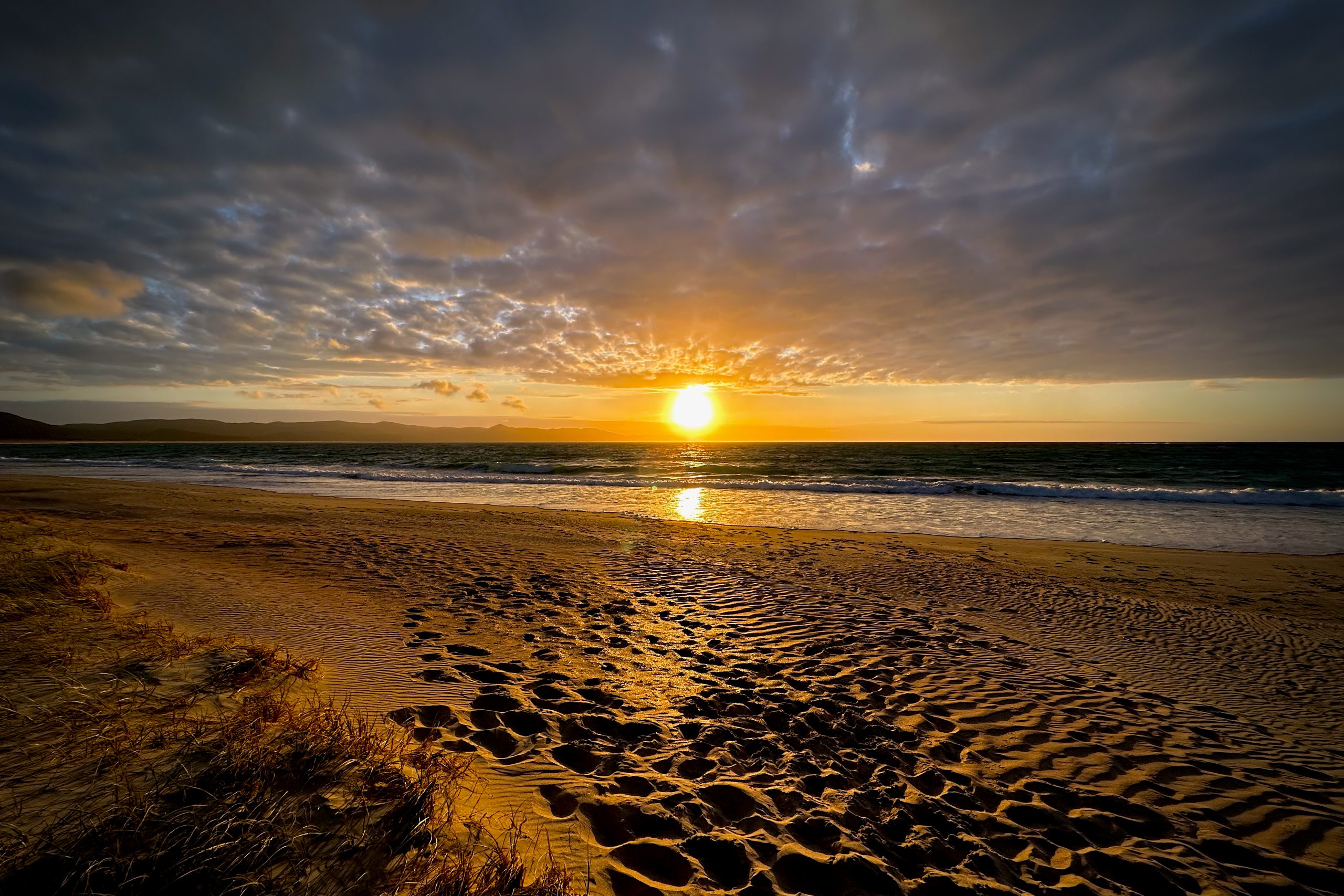 Evening light reflects across rippled sand and gentle waves as the sun sets over the ocean, capturing the warmth and calm of a coastal sunset.