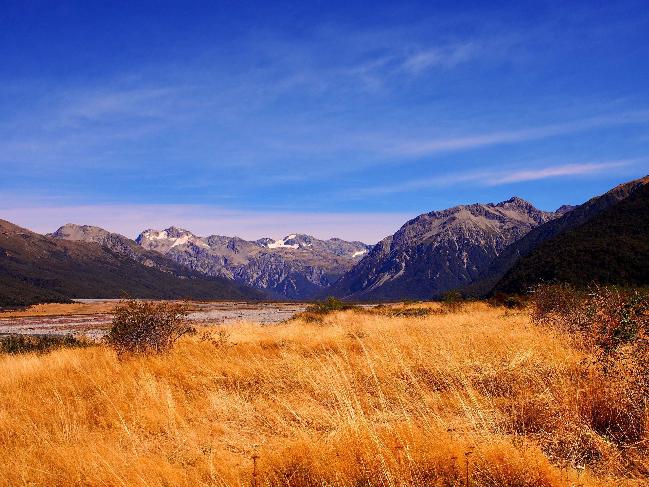 Late light moves across golden alpine grasslands beneath a wide blue sky and distant mountains. The contrast of warm foreground and cool peaks creates a bright, open landscape suited to modern and natural interiors.
