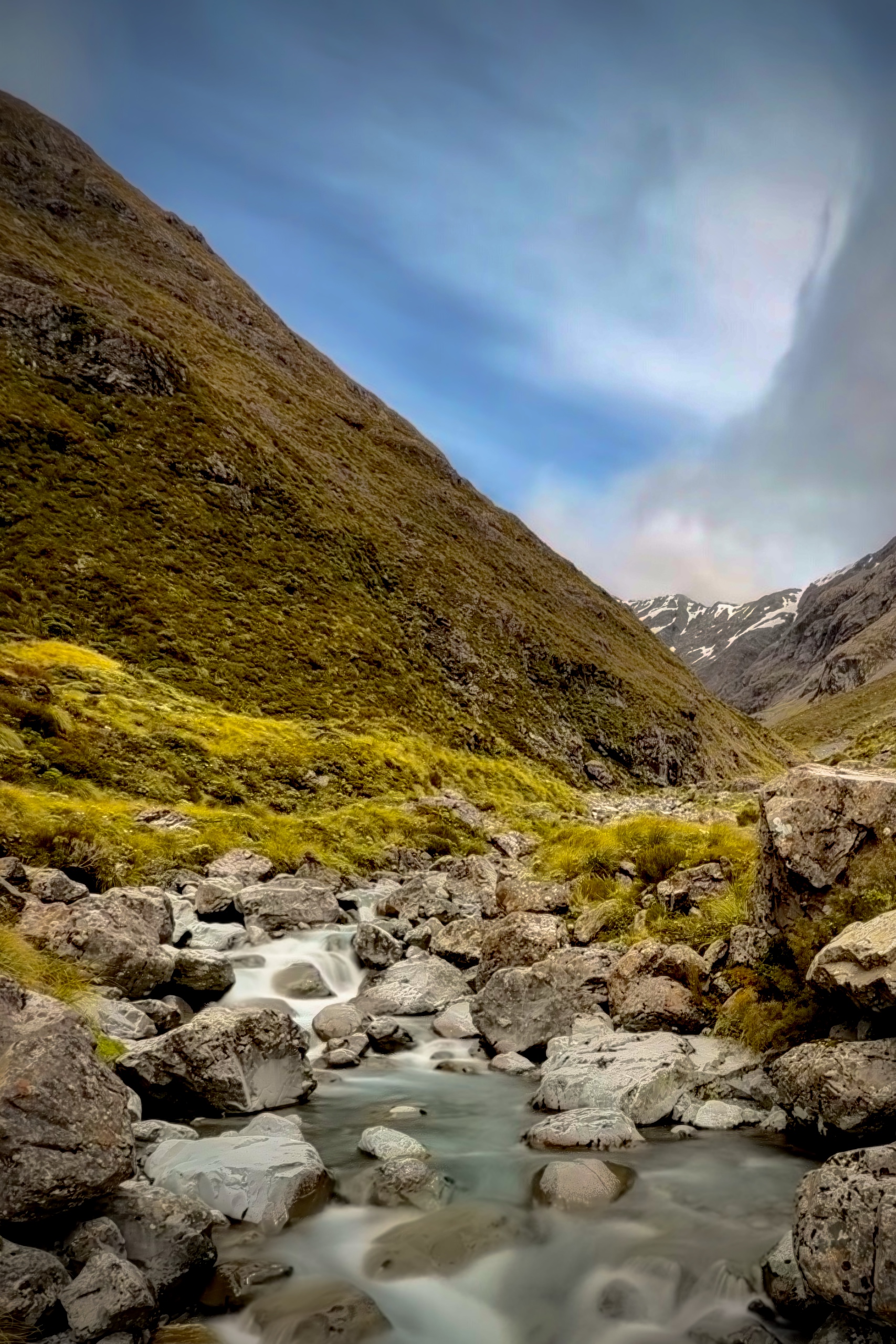 An icy stream winds through a rocky alpine valley, framed by steep mountain slopes and high country landscape.