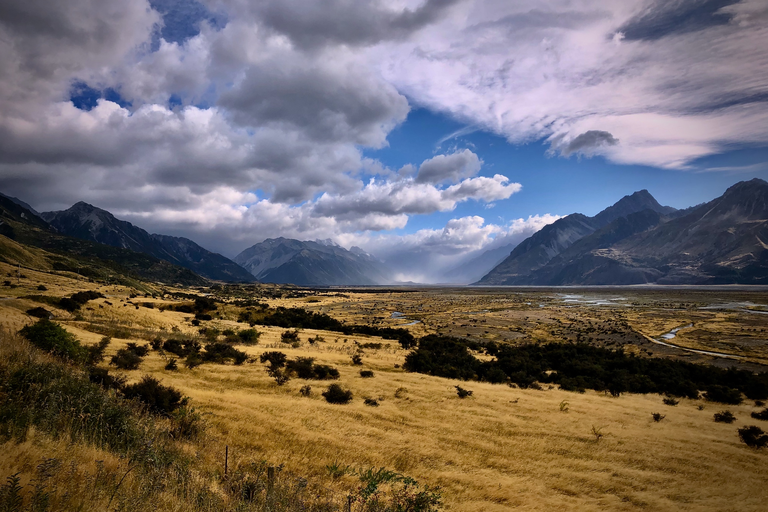 Dark storm clouds gather over a wide alpine valley, with light breaking through across the golden grasslands below. The contrast between shadow and sun creates a sense of scale and approaching weather.