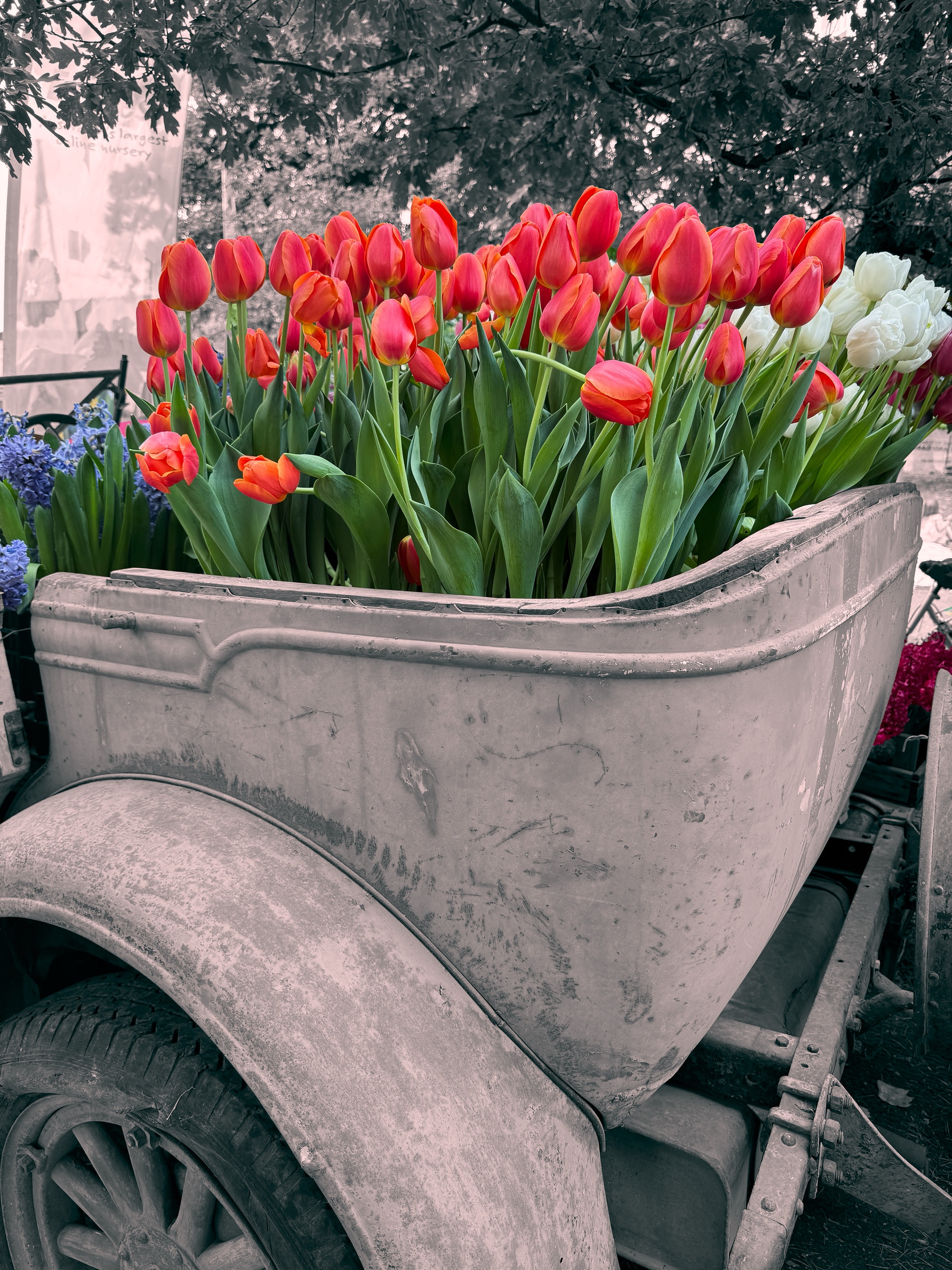 Bright red tulips overflow from a weathered garden cart, contrasting vivid spring colour against soft muted surroundings.